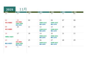 11月 営業日のお知らせ 2025.10.20 11月の各店の営業日のお知らせです。 下記のとおり11月は新中学生採寸会の為、店舗休業日がありますのご了承下さい。 令和8年度 新中学生 制服予約受付中! お申込は⇒こちらから この記事をシェアする: